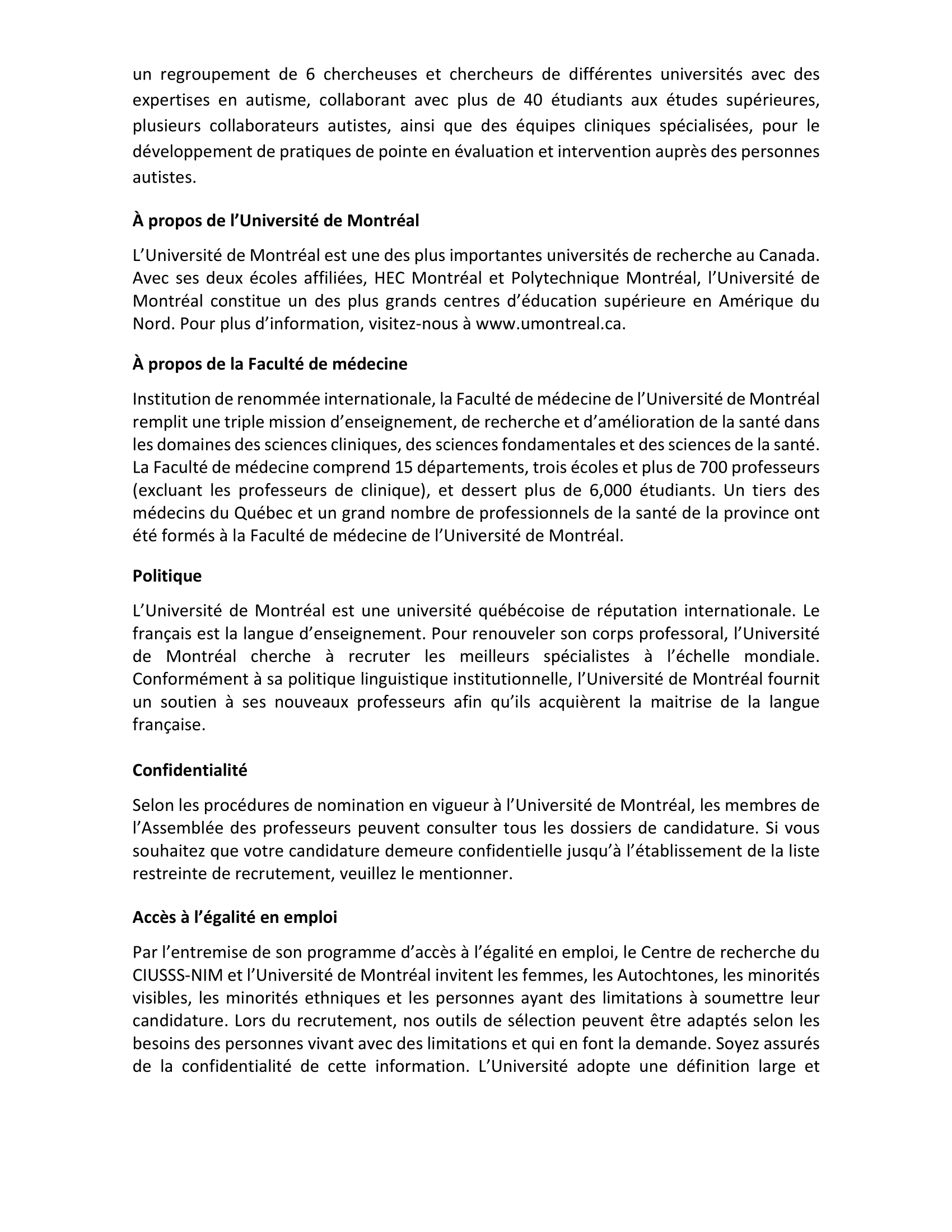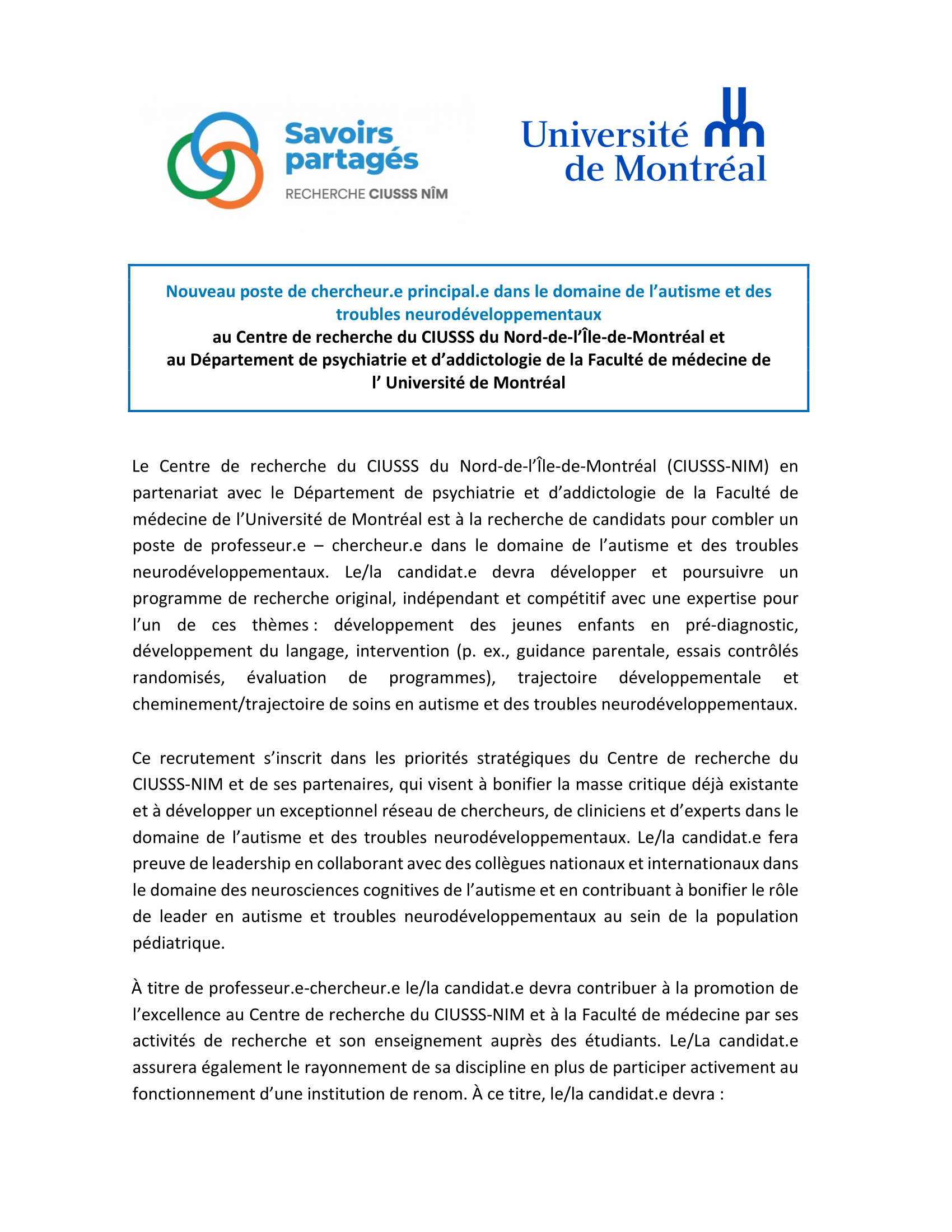 Le Centre de recherche du CIUSSS du Nord-de-l’Île-de-Montréal (CIUSSS-NIM), en partenariat avec le Département de psychiatrie et d’addictologie de l’Université de Montréal, recrute un·e professeur·e – chercheur·e dans le domaine de l’autisme et des troubles neurodéveloppementaux.