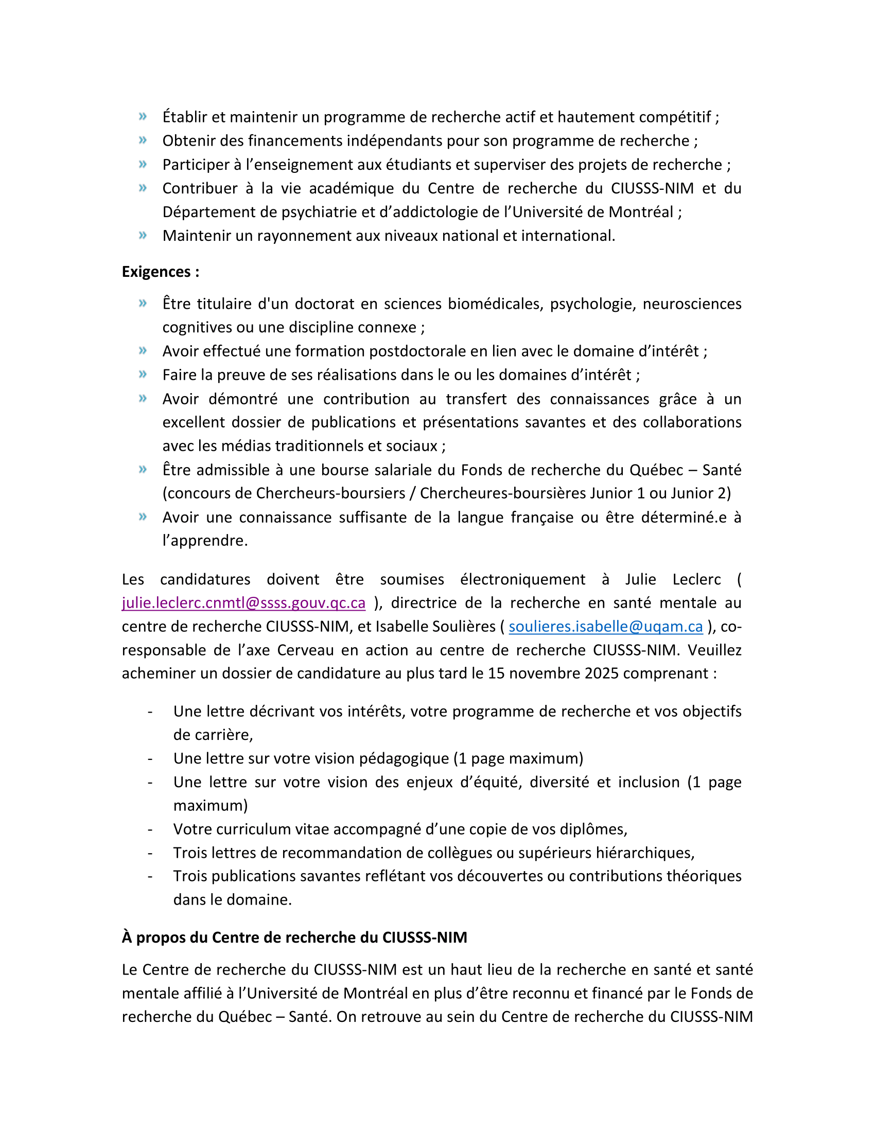 • Doctorat en psychologie, sciences biomédicales, neurosciences cognitives ou discipline connexe