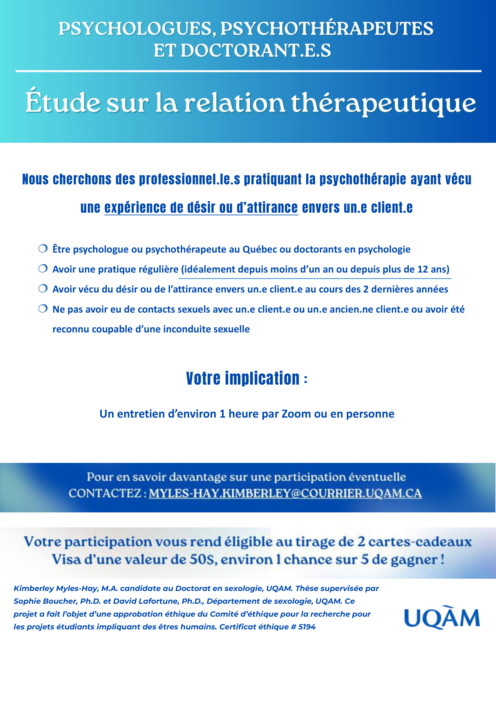 Une étude doctorale menée par Kimberley Myles, psychothérapeute et doctorante en sexologie à l’Université du Québec à Montréal (UQAM), est actuellement à la recherche de participant·e·s.