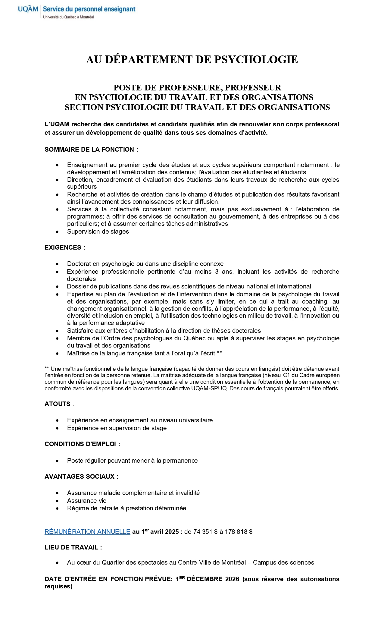 Le Département de psychologie de l’UQAM recrute un·e professeur·e en psychologie du travail et des organisations pour soutenir l’enseignement, la supervision et le développement de la recherche dans ce domaine.