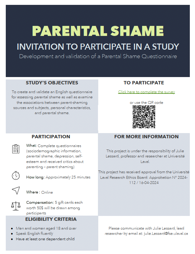 A research team from Université Laval is conducting a study aimed at creating and validating a questionnaire designed to assess parental shame. The study also seeks to explore how different sources and types of parent-shaming (critical comments about parenting), along with parents’ personal characteristics, relate to feelings of shame.