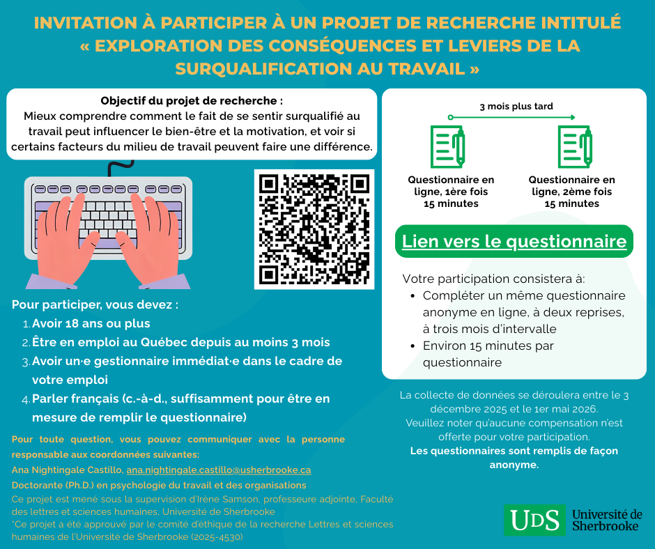 Une équipe de recherche de l’Université de Sherbrooke mène actuellement une étude portant sur la surqualification au travail.