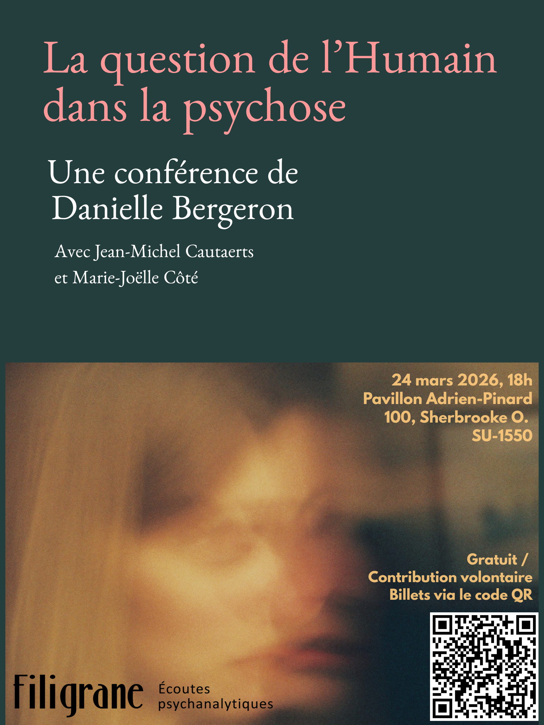 La revue Filigrane vous invite à une conférence de Danielle Bergeron intitulée La question de l’humain dans la psychose, qui se tiendra le mardi 24 mars à 18 h à l’Université du Québec à Montréal, pavillon Adrien-Pinard (local SU-1550).