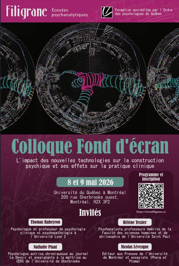 Cet événement réunira Thomas Rabeyron, Hélène Tessier, Nathalie Plaat et Nicolas Lévesque, qui échangeront autour des transformations contemporaines liées aux technologies numériques et de leurs effets sur la construction psychique et la pratique clinique.