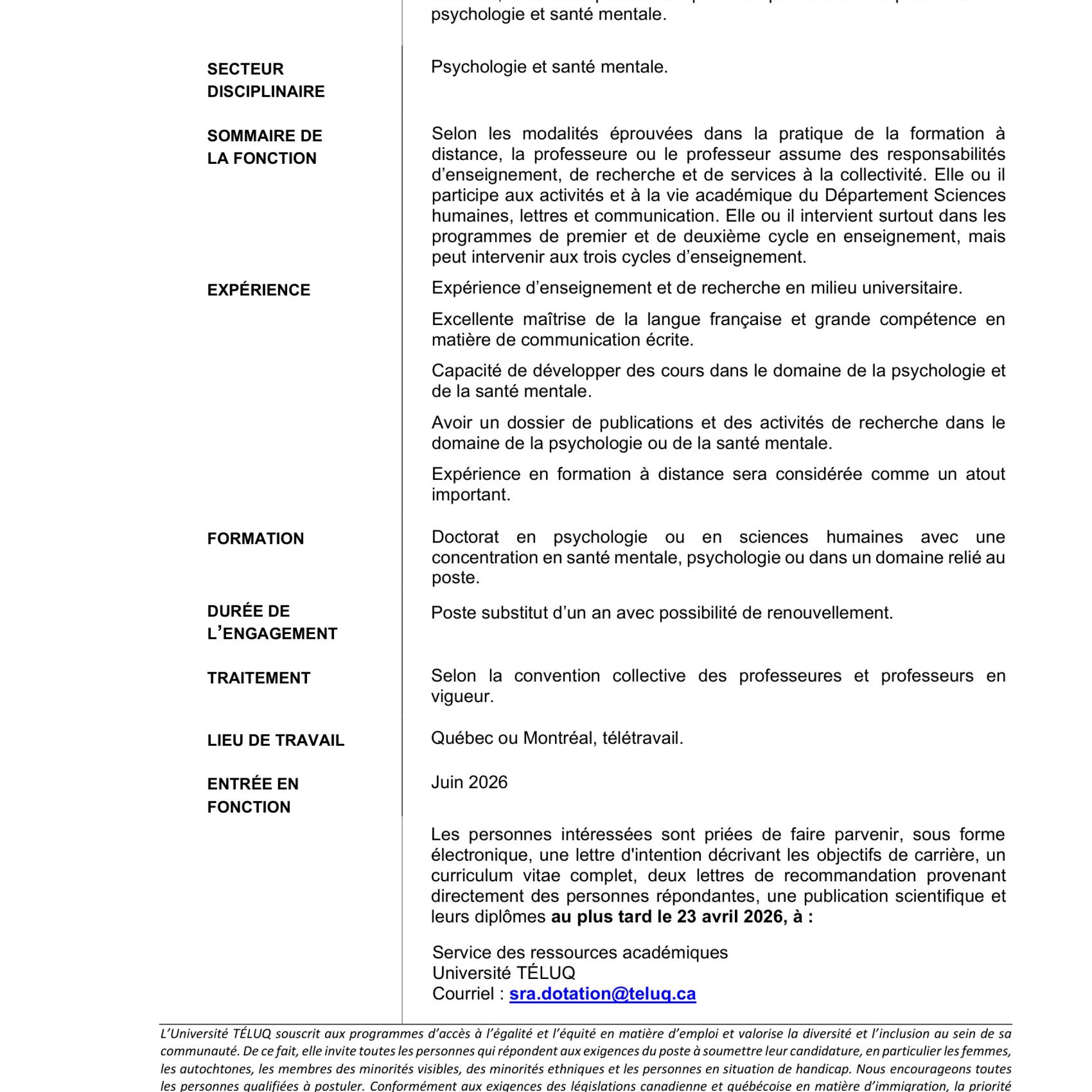 Le poste s’adresse à des personnes détenant un doctorat en psychologie ou en sciences humaines avec une concentration en santé mentale, en psychologie ou dans un domaine connexe. Les candidatures doivent aussi démontrer une expérience en enseignement et en recherche en milieu universitaire, une excellente maîtrise du français écrit, ainsi qu’une capacité à développer des cours en psychologie et en santé mentale. L’expérience en formation à distance sera considérée comme un atout important.