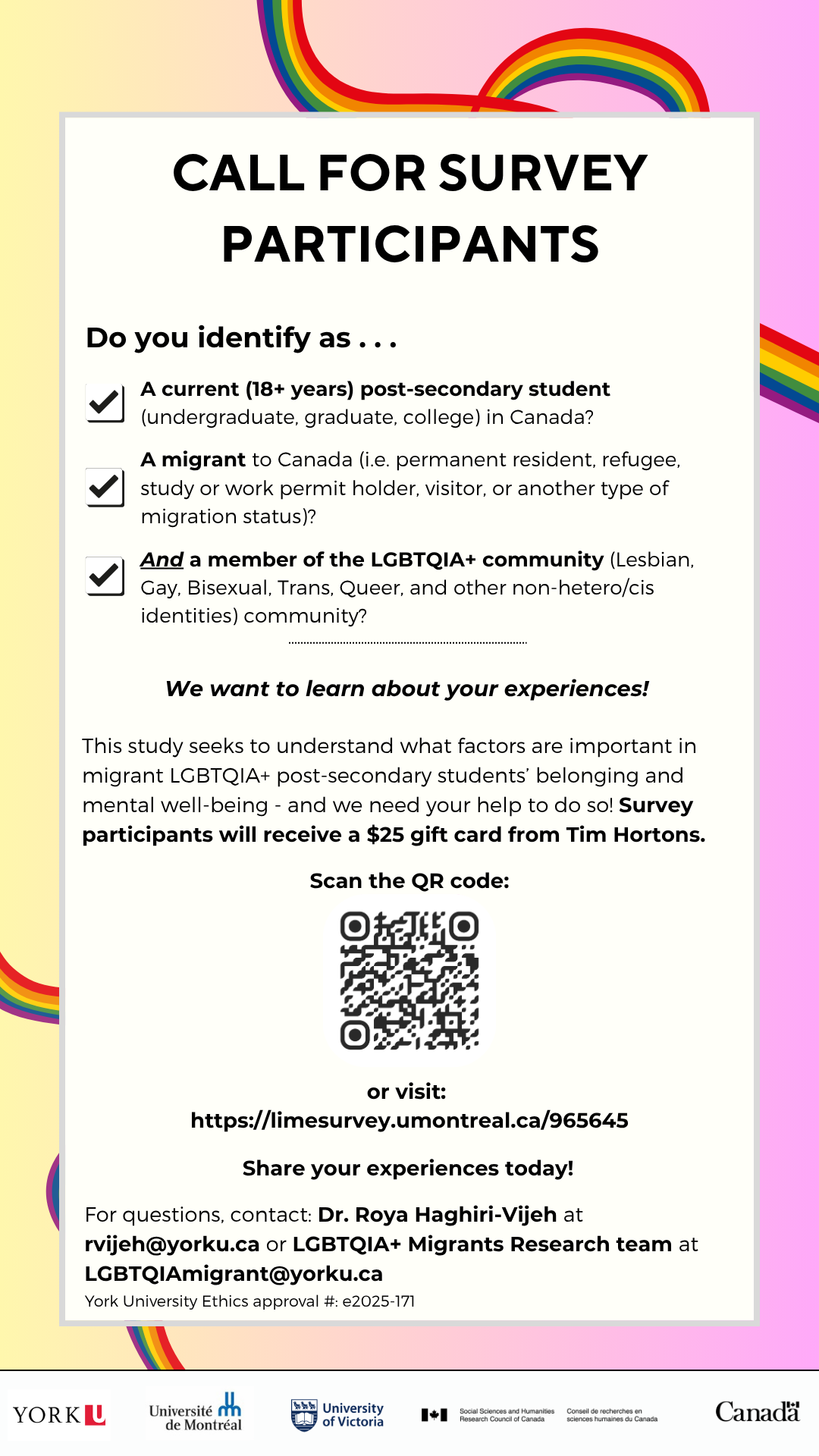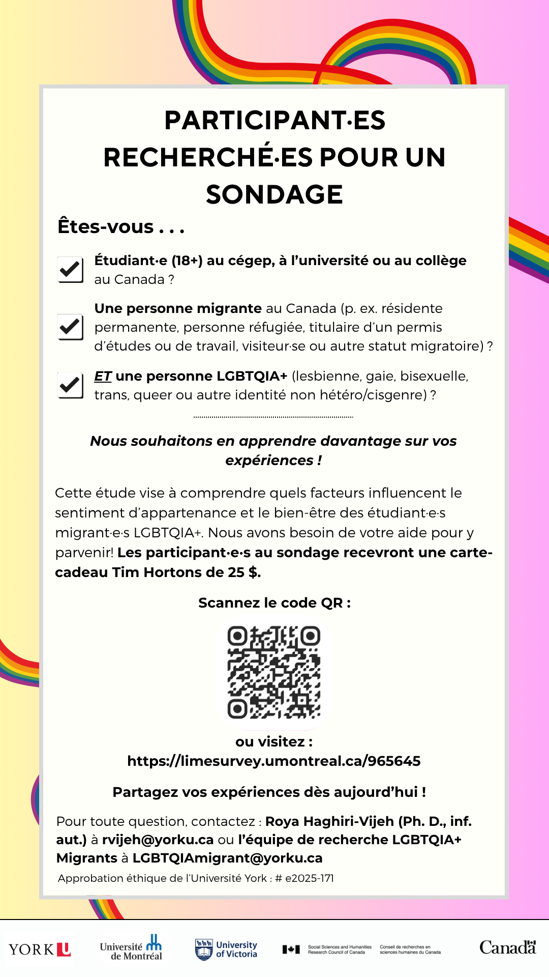 Le sondage s’adresse aux personnes LGBTQIA+ migrantes âgées de 18 ans ou plus, inscrites dans un établissement postsecondaire au Canada. Il est offert en français et en anglais.