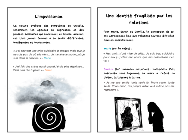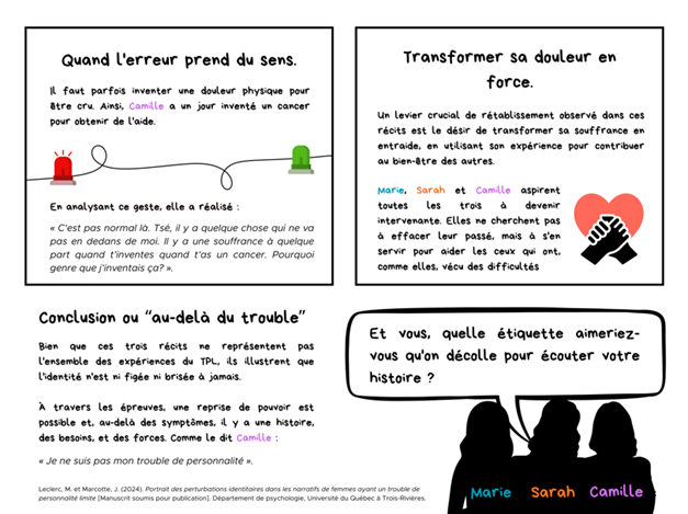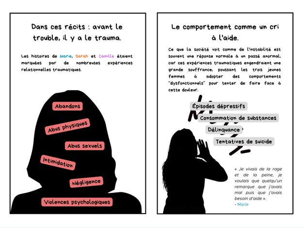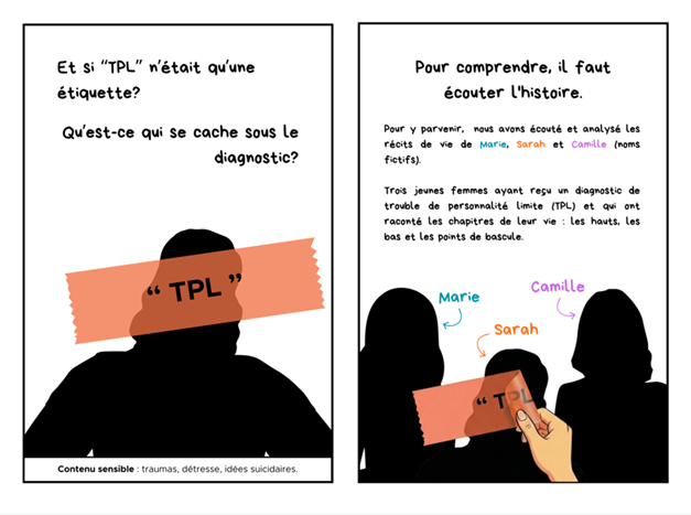 Pour déconstruire la stigmatisation du TPL, il faut regarder sous l'étiquette. Ce projet vulgarise une analyse de récits de vie qui révèle ce qui se cache derrière les symptômes « dérangeants » : une histoire de traumatismes. Mais le récit ne s'arrête pas à la souffrance. Il dévoile un chemin vers l'espoir et la « générativité », où ces femmes transforment leur vécu difficile en force pour aider les autres.