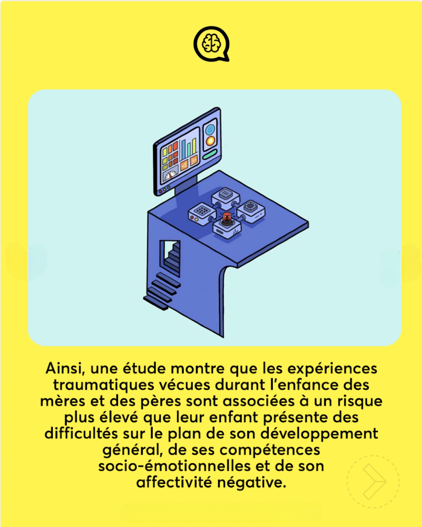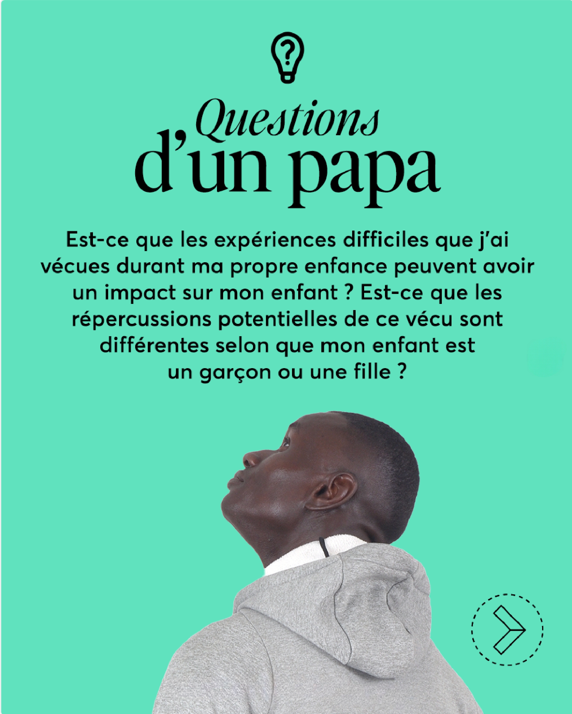plateforme sociale, conçu pour capter l’attention sur un sujet encore peu abordé dans l’espace public : l’expérience des pères et ses répercussions sur le développement de leurs enfants. À travers une série d’images accompagnées d’illustrations faites à la main et de courts textes, le projet invite à réfléchir à la manière dont certaines expériences traumatiques vécues par les parents au cours de leur vie, lorsqu’elles s’accumulent, peuvent façonner le fonctionnement de l’enfant dès la petite enfance.